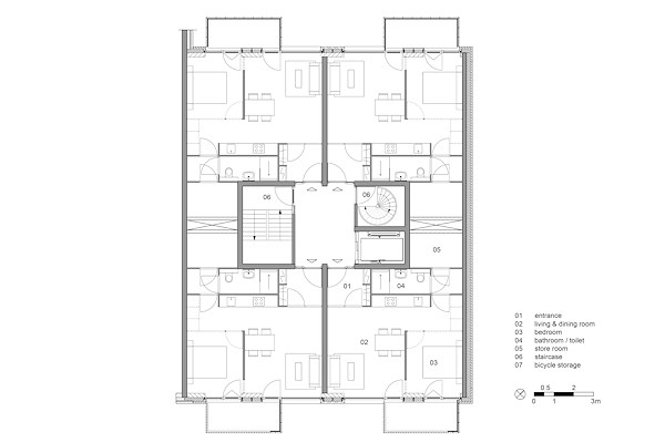 Op de begane grond is de ruime entreehal vormgegeven als een interne steeg die de straat verbindt met de collectieve binnentuin en de fietsenstalling. Meer dan alleen een entreehal is het de plek bij uitstek om je buren tegen het lijf te lopen. De fietsenstalling is bewust niet verstopt in een kelder maar juist vormgegeven als een integraal onderdeel van de entree met een prominente positie aan de straat en een hoogwaardige afwerking en belichting.