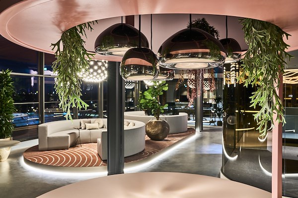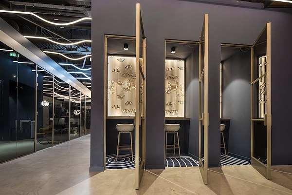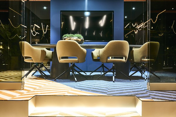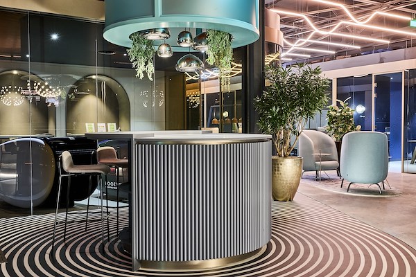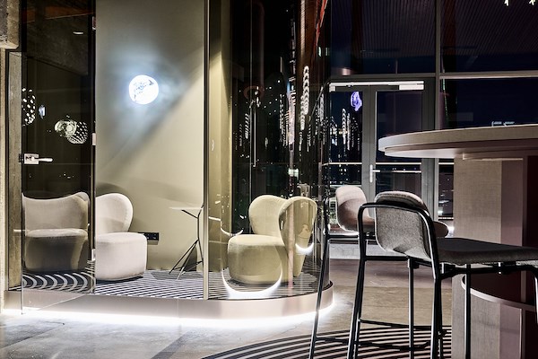 Door het toepassen van ronde en vloeiende vormen “smelten” de diverse functies en interieurelementen in elkaar over wat zorgt voor synergie, rust en inspiratie. Glooiende computergestuurde plafondverlichting, ronde brons getinte glazen wanden en luxe afgewerkte detaillering in zowel het interieur en het maatwerk meubilair zorgen voor een hotel-chique karakter met een technisch randje. Een hotel voor ondernemers.