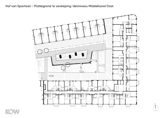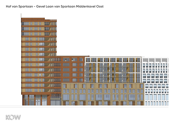 Het door BPD ontwikkelde project ‘Hof van Spartaan’ komt in de nieuwe wijk ‘Laan van Spartaan’, een jonge, frisse woonwijk in het levendige Bos en Lommer net buiten de ringweg A10. Het hart van de buurt bestaat uit sportieve voorzieningen zoals voetbalvelden, een klimhal en een sporthal. Hof van Spartaan bestaat uit de delen Oost en West. Deel Oost is ontworpen door KOW, deel West door Studioninedots.
