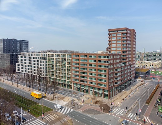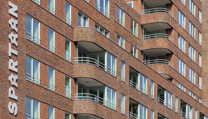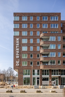 Het door ons ontworpen deel Hof van Spartaan Oost bestaat uit het appartementencomplex ‘De Spartaan’ met een deel van 7 bouwlagen en een toren (52 m1) van 15 bouwlagen met in het totaal 193 huur- en koopappartementen, variërend van 45 m2 studio’s, maisonnettes van 65 m2 tot een penthouse van 186 m2. Het complex staat op een verhoogde plint met maisonnettes en ruimte voor winkels en/of buurtgerichte voorzieningen. De doorgaande plint zorgt voor een levendig straatbeeld in de Jan van Galenstraat en de Rinus Michelslaan.