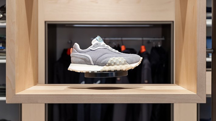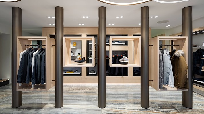 De compacte ruimte van dit winkelgedeelte is optimaal benut door te spelen met diepte. De rij van vijf kolommen in het midden van de winkel, waarvan één dragend, brengen gelaagdheid en ordening aan in het interieur. In de hoogte zorgen lichtringen, deels verwerkt in het plafond en deels pendelend op verschillende hoogtes, voor meer gevoel van ruimtelijkheid. Ook dankzij de flexibele indeling van de nieuwe wandpresentaties wordt de ruimte optimaal benut. De leg- en presentatieplanken kunnen eenvoudig uitgenomen en verplaatst worden, waardoor de inrichting van de winkel mee kan wisselen met de collecties. De uitneembare planken zijn elk voorzien van ledverlichting die aangaat bij het bevestigen in de kast. Daardoor is ook het lichtplan flexibel en optimaal afgestemd op wisselende presentaties.