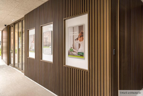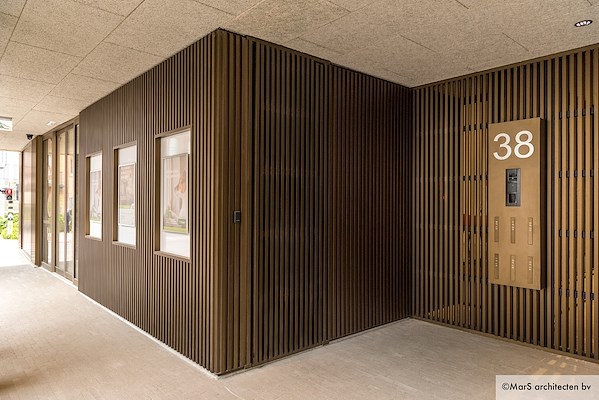 Aluminium gevelbekleding, uitgevoerd in houtlook.