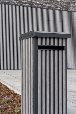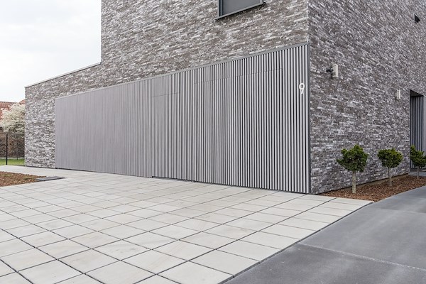 Voor deze alleenstaande villa in Meerhout werd geopteerd voor een natuurlijke look & feel en bijpassende natuurkleuren. De grijze gevelstenen worden prachtig aangevuld met een basisprofiel in RAL 7021 fijnstructuur en Mato 1 in de houtlook Sheffield Oak Concrete. Ook de brievenbus werd bekleed met Mato profielen.