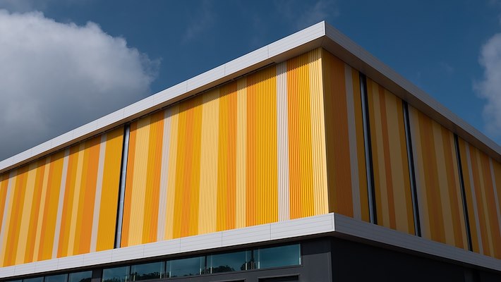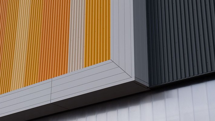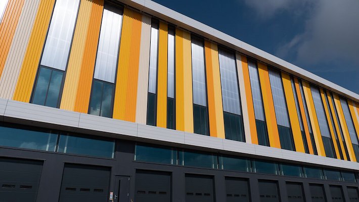 Het is een warm kleurenspel met de symmetrische trapeziumprofielen SAB 45/900 op een zichtlocatie direct naast de A12 bij Nieuwegein-Utrecht. De streepjescode inspireerde Architect Dick Verhaar bij het ontwerp van de gevel van het nieuwe Jumbo DC. De architect van Da Vinci Vastgoed realiseerde dit beeld met trapeziumprofielen SAB 45/900 in een range aan gele en oranje kleuren in Colorcoat Prisma