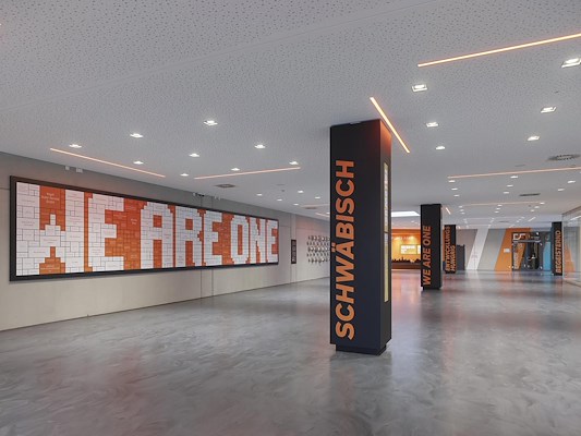 Blikvanger in de foyer is de Arturo PU2030 Gietvloer in de clubkleur oranje (RAL 2011), die de bijna 24 m² grote sponsormuur voor de sporters ingang markeert . Op de zogenaamde ‘Wall of Fan’ hebben 699 donateurs zich laten vereeuwigen in het indrukwekkende opschrift ‘We are One’. “We hebben dit clubmotto met een folie op de oranje gietvloer aangebracht”, vertelt Marcello Diso van applicateur Rauer Bau- und Betonsanierung GmbH. “De zijdematte Arturo PU7320 Toplak is aangebracht als laatste beschermlaag.” De lak zorgt bovendien voor de benodigde R10 antislipwaarde, aldus Zubke. “Hierdoor blijft de gietvloer voor lange tijd hygiënisch én mooi.”