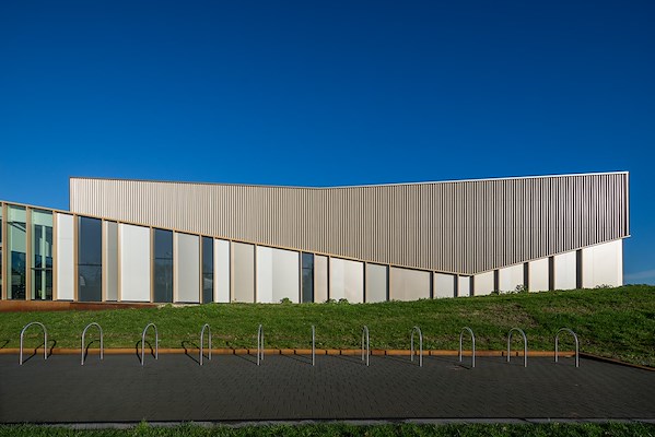It takes advantage of the height differences found at the site. An ample part of the complex is located below ground. The roof emphasizes the most important parts of the building and its surroundings and opens out onto the key public zones. The landscape and the building intersect half-way along the side wall, where the design incorporates a grand entrance area. Both entrances come together at a recess in the façade, where they are linked by a staircase. The façade design with ALUCOBOND® in Sparkling White Silver, Champagne metallic and Bronze metallic is an important part of a dynamic experience of the building. The vertical layout and the angle of incidence are decisive for the visual connection with the interior and the landscape.