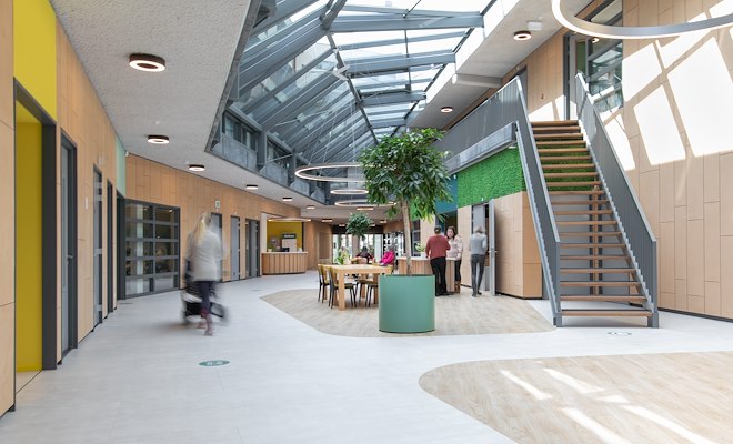 Door het ontwerp is een aangename sfeer gecreëerd waar men zich welkom voelt. In o.a. het centrale atrium is dit gedaan d.m.v. lichte en warme materialen, planten en mos op wanden en sfeervolle verlichting.