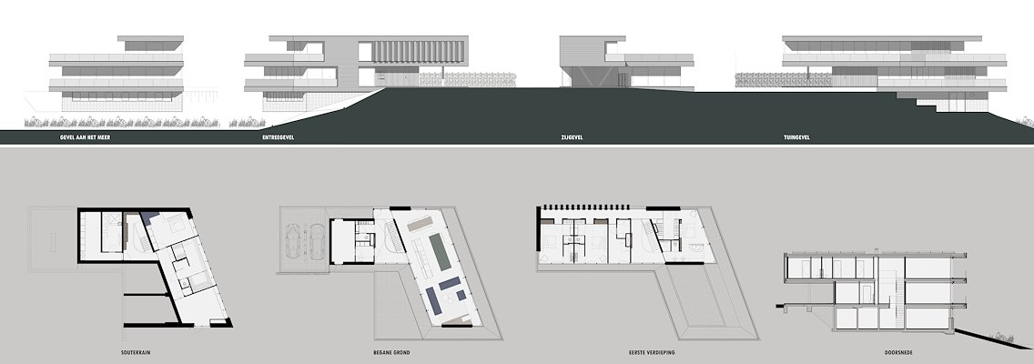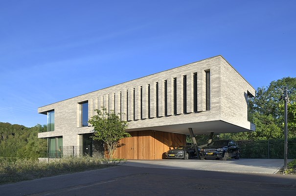 Een krachtig lijnenspel tussen open en dicht zorgt ervoor dat de villa goed landt op de plek. Uitkragende terrassen aan de open waterzijde zijn een verlengstuk van de woonruimte en versterken de relatie met het landschap. Ze zorgen ook voor zonwering voor de verdiepingshoge ramen en plasticiteit in de gevel. De straatzijde kenmerkt zich door de royale overkraging voor het parkeren van meerdere auto’s. Het volume daarboven heeft een krachtig ritme van uitkragende baksteen lamellen. Deze combineren privacy en lichtval in de gang. Aan de andere zijde van dit volume openen de slaapvertrekken zich naar de besloten tuin.