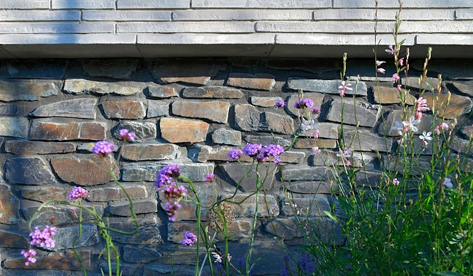 Een zorgvuldige materialisatie vergroot de natuurbeleving vanuit de villa. De plint komt omhoog uit het groene talud en is uitgevoerd in grove leisteen. Boven deze massieve plint komt de juist lichtere bouwmassa extra los van het talud. De gevels zijn uitgevoerd in de lichtgrijze baksteen Kolumba. De langformaat steen versterkt de horizontale geleding en de relatie met het uitzicht. De hardhouten gevellamellen passen bij de natuurlijke omgeving en geven een fijne ritmiek. Hardglazen balustrades en wit gestucte plafonds van de terrassen maken de woning af.