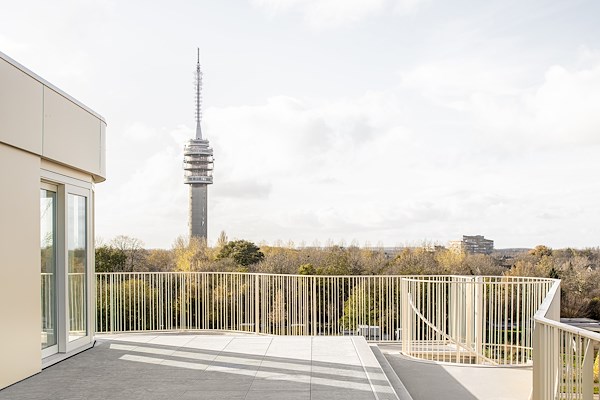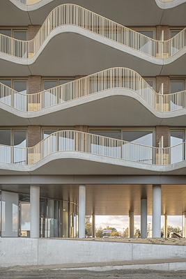 De stedenbouwkundig bepaalde horizontale uitwerking is doorontwikkeld tot een rondlopende en golvende balustrade. Deze geeft het gebouw een krachtige identiteit binnen het stedenbouwkundige ensemble. De gegolfde balkons hebben zicht over het water aan de oostkant en vangen het zonlicht uit het zuiden in de naar voren stekende punt. Tegelijkertijd geeft de gegolfde punt op de galerij aan de westkant een extra semi-private buitenruimte met avondzon. De gegolfde vorm refereert aan het alom vertegenwoordigde water en de uitkraging rondom zorgt voor passieve zonwering om oververhitting tegen te gaan. Het complexe totaalbeeld is haalbaar gemaakt door één gegolfde mal gespiegeld toe te passen per verdieping. Ook zijn er twee vluchttrappen opgenomen in de golving van de galerij. Zo worden de expressieve balkons een integrale ontwerpoplossing.