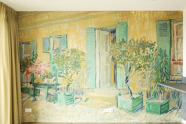 , waarbij de muurbeschermingsplaten kunnen worden geprint met een eigen ontwerp of foto, heeft Storax de wanden voorzien van verdiepingshoge impressionistische kunstwerken. Deze geven de woonkamers een pastoraal karakter en verbinden het interieur met het waterrijke polderlandschap van de Blaricummermeent. In de hallen en diverse andere ruimtes zijn de muren beschermt met de platen van het type