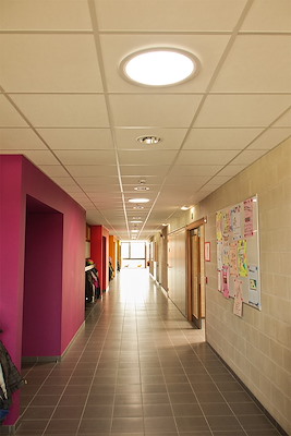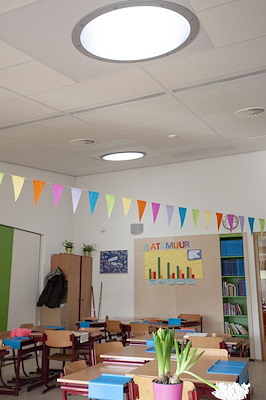 zijn tijdens een verbouwing daglichtbuizen geplaatst. ‘Daglicht is veel prettiger aan de ogen dan kunstlicht. Bovendien is het nu zelfs op donkere dagen licht in onze school. De leerlingen zijn rustiger en ook voor de docenten is het prettiger werken,’ vertelt meneer Bekdemir, conciërge van Heerenlanden College.