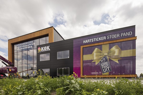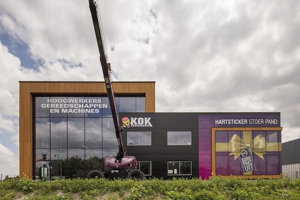 Direct zichtbaar langs de A28 nabij Zwolle staan de hoogwerkers van Kok Verhuur opvallend langs het nieuwe, trots glimmende, gebouw op bedrijventerrein H2O.