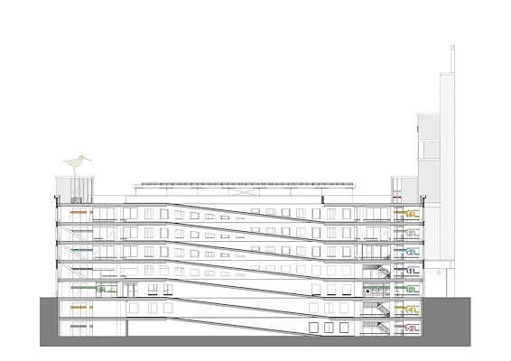Na binnenrijden is de functie van het parkeergebouw onmiskenbaar. Op de kolomvrije vloervelden kunnen op acht verdiepingen auto’s parkeren. De signing (een ontwerp van bureau Braining the Future) van de parkeerdekken maakt elke verdieping herkenbaar aan een eigen kleur. Symbolen en pictogrammen zorgen voor oriëntatie en bewegwijzering.