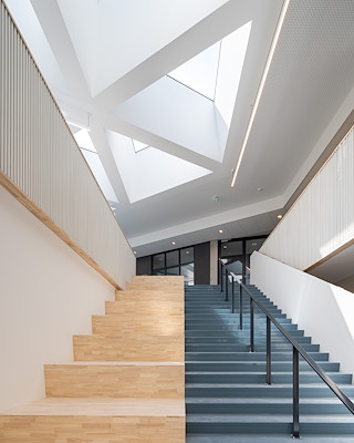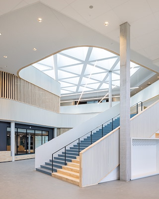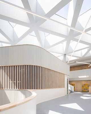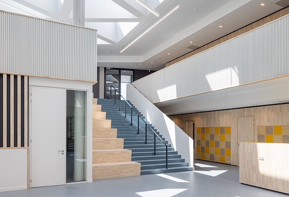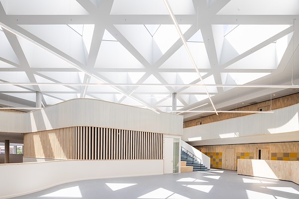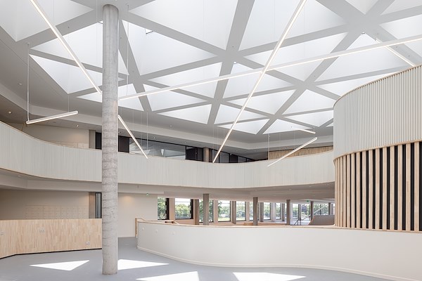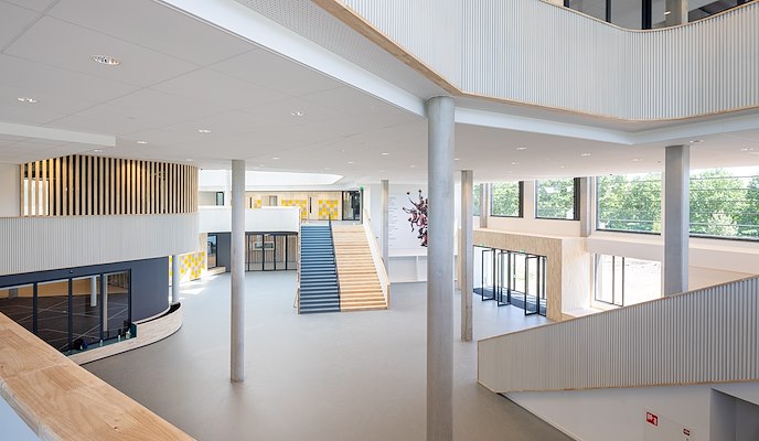 Een functioneel, gezond, toekomstgericht schoolgebouw. Vanuit een centraal hart met leerlandschappen rondom een vide waaieren drie brede armen uit waarin je klaslokalen, werkpleinen en ateliers, leerlabs, een auditorium en tal van andere functies vindt. Tussen de armen vind je pleinen voor de entree, de fietsen en een groene omgeving.