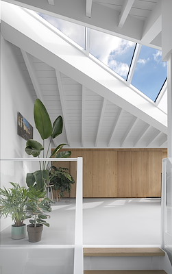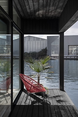 Binnen de gegeven grenzen van elk waterperceel is elke woning uniek in architectuur en interieur. Alle bewoners kozen hun eigen architect. De opdrachtgever daagde ons uit om de ruimte binnen de grenzen van het kavel paspoort te maximaliseren. De drijvende woning heeft een diagonaal gekanteld schuin dak. In de plattegrond resulteert dit in een optimalisatie van de bruikbare ruimte en een mooi terras, maar het geeft de woning ook zijn karakteristieke architectonische vorm.