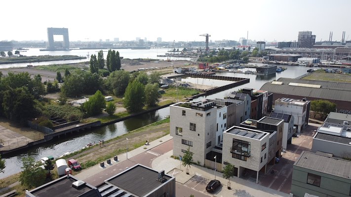 Goed geïsoleerd woonwerkhuis met een groenblauw dak, zonnepanelen, stadswarmte, wtw douches en natuurlijke ventilatie. De patio functioneert als groene long, op het balkon staat een druif en op het dak twee waardbomen. Daar is ook een waterberging. Op de begane grond groeit een vijgenboom in de geveltuin over de hele lengte van het huis. Een lift maakt het levensloopbestendig en dus nog duurzamer.