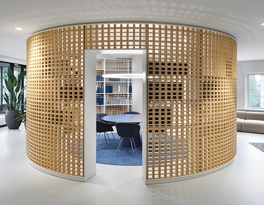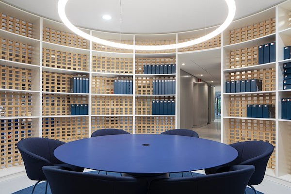 Centraal op de tweede verdieping bevindt zich de bibliotheek; een grote cilindrische ruimte van geperforeerd keramiek. Deze multifunctionele ruimte is het intellectuele hart van het kantoor en kan tevens worden gebruikt als een vergader- of werkruimte. De cilindrische vorm fungeert als natuurlijke scheiding en definieert de verschillende soorten werkruimten eromheen.