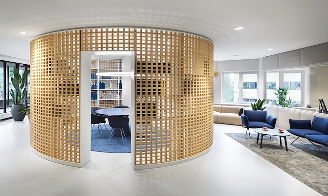 Op de eerste verdieping zijn geperforeerde keramische voorzetwanden toegepast die de kantoren privacy bieden én een visuele verbinding maken met andere ruimtes op de eerste verdieping.
