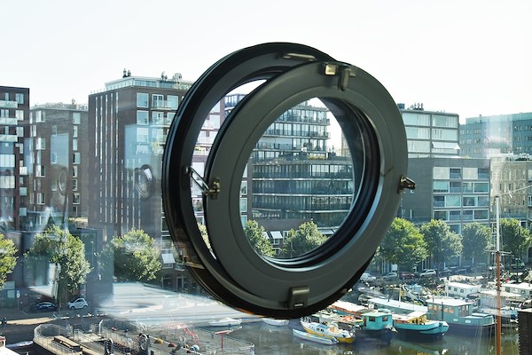 Het effect van zwevende bouwlagen wordt geoptimaliseerd door de terug liggende stroken driedubbel glas voorlangs de verdiepingen, ramen van vloer tot plafond met dunne nagenoeg onzichtbare verticale sponningen. Om het niet al te fragiel te laten lijken zijn in een strak ritme in de ramen glazen patrijspoorten geplaatst, van binnen gezien op ooghoogte, met een klik te openen. Deze ronde ramen zijn op te vatten als een verwijzing naar het maritieme verleden van het gebied, maar eerder toch herinneren ze aan de vroegere tuimelramen van De Walvis.