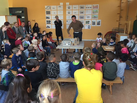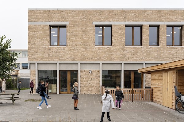 Het nieuwe gebouw is georganiseerd rondom een aantal leerclusters met ruimten voor samenwerken, spel, concentratie en rust. Het interieur heeft een natuurlijke uitstraling door het gebruik van hout en metselwerk. De oude, gemetselde zuidgevel komt midden in het nieuwe gebouw te staan en vormt het hart van de nieuwe school. Hier komen alle leeftijden onder een groot daklicht en rond een centrale keuken samen. Omdat deze keuken direct aan de hoofdentree is gelegen ontstaat een ontwapenende en huiselijke sfeer.