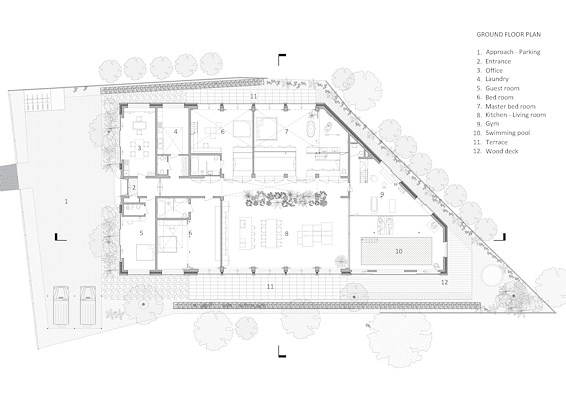De binnenruimte loopt naadloos over in de buitenruimte. De oorspronkelijke ramen hadden een hoge, functionele, borstwering waardoor relatie tussen binnen en buiten er nauwelijks toe deed. Muren zijn tot op het tuinniveau open gezaagd waardoor enorme gevelopeningen met verticale schuiframen konden worden ingevuld, waar je gewoon onderdoor kan lopen. De vloer is van gepolijst woonbeton en weerspiegeld de openheid met de tuin. Het terras rondom het huis loopt naadloos over naar binnen. De buffer rondom het huis met vijf meter hoge bamboe creëert een prive buitenruimte dat de villa visueel scheidt van de omringende woongebouwen.