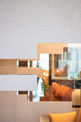 We hebben dit opgelost door het concept van ‘follies’ toe te passen, vervreemdende objecten als stijlelement en identiteitslaag in de vorm van een huis. Met een puntdak, als de simpelste en meest herkenbare vorm. In een simpele maar met aandacht vormgegeven houten open constructie vorm. We pasten dit toe in het groot, centraal in de showroom die de locatie van de verschillende onderdelen in de showroom vindbaar maakt. En in kleinere vormen om de vindplek van servicebalies aan te duiden of om als een cocon een stilteplek te omsluiten.