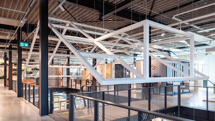 De uitdaging bij vormgeving van het interieur was dat het product dat getoond wordt ook gaat over interieur. De inrichting van de showroom moest daar de ruimte aan geven, zonder dat het een kakafonie aan elementen en stijlen wordt. En de ruimte moest met deze veelheid aan interieur elementen nog steeds leesbaar blijven.