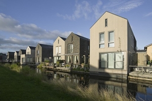 Opvallend is de verweving en afwisseling van metselwerk en houten gevelbekleding. Dit is een vertaling van de ‘goedjaar’ uitbreiding van oude boerenschuren, waarbij na een goed oogstjaar de schuur in de lengte werd uitgebreid. Net als deze schuren zijn de woningen niet in de hoogte, maar in de lengte van de kavel uitbreidbaar. Hierdoor komt de kopgevel in het water te staan. De horizontale belijning van het metselwerk is versterkt door de stootvoegloze uitvoering, het wit transparant afgewerkte western-red-cedar houtwerk is verticaal aangebracht. Beide materialen zijn typerend voor traditionele landelijke woonhuizen uit deze omgeving, maar vormen door hun samenspel een intrigerend contrast. Door het zorgvuldige ontwerp vormen deze eigentijdse woningen een passend decor voor oer-Hollandse taferelen.
