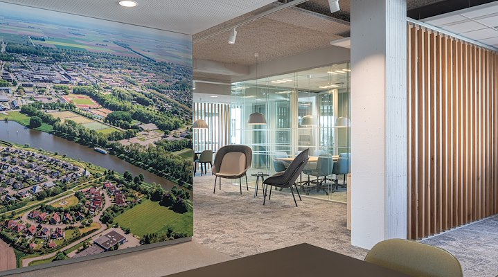 Het vernieuwde gemeentehuis is een toonbeeld van duurzaamheid en circulariteit. Het streven was om de kringlopen van energie en materiaal te sluiten. Het heeft nul op de meter. Tevens heeft het een circulair interieur. Wat houdt dat laatste in? Het begint met het ‘slim’ slopen van het bestaande inbouwpakket om de hoeveelheid afval te reduceren. Zo kregen plafondlatten een tweede leven als afwerking van publieksbalies. Vervolgens zijn biobased materialen toegepast, waaronder biolaminaat met mosselgruis en essenhout van Staatsbosbeheer. Met leveranciers zijn afspraken gemaakt over hoe na gebruik producten teruggenomen en verwerkt gaan worden . Ten slotte zijn de maatwerk interieurelementen demontabel en herbruikbaar ontworpen door verlijmde verbindingen te vermijden. De QR-code erop geeft geïnteresseerden inzicht in de herkomst van het materiaal.