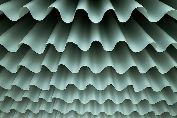 Ook in de praktijk hebben we nog cruciale aanpassingen gedaan. Zo bleek bij het hangen van de stof in de ruimte dat het cruciaal was dat de stroken de grond niet raakten; anders voelde het bedrukt en beklemmend, teveel als een bedompte grot. Dat was het tegenovergestelde van ons beoogde effect. De afmetingen, lengten en golf waar we op uitgekomen zijn resulteert in een ruimte die tegelijkertijd afgescheiden en open is, bijna vloeibaar, intiem maar verbonden met het geheel, knus maar licht.