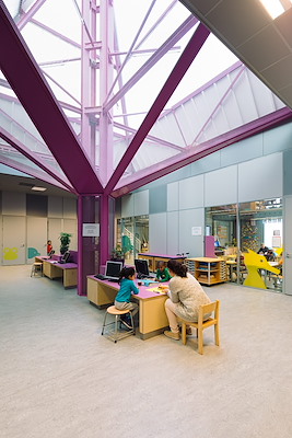Een flexibel binnenwandsysteem van dichte en transparante delen zorgt voor meer openheid. Door een deel van het dak open te werken, ontstond een nieuwe patio die de ruimtes eromheen van daglicht voorziet. Zo kreeg het gebouw een nieuwe indeling, met duidelijke entrees in een transparante gevel. Het is opnieuw fris en functioneel, met respect voor het oorspronkelijke ontwerp.