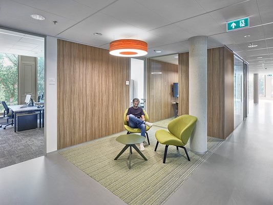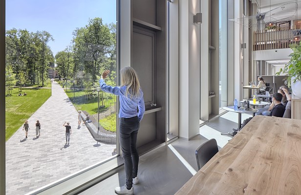 Naast het grand-café kom je elkaar tegen op één van de prominent gelegen watervaltrappen. Ze vormen de hoofdroute in het gebouw en schakelen de belangrijkste onderwijsruimten en onderzoeksfaciliteiten aaneen. Ook de verschillende huiskamers fungeren als ontmoetingsplek. Bij zonnig weer nodigt het terras uit om nog even te blijven hangen, om daar samen de dag af te sluiten.