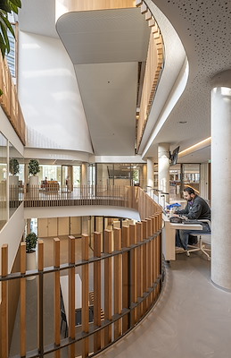 De nieuwe Faculteit der Sociale Wetenschappen inspireert en bruist. “Het gebouw is erop ingericht om de interactie tussen studenten, medewerkers en onderzoekers te versterken”, zegt Koen Fleuren van de Radboud Universiteit. Dat is een groot verschil met de oude situatie. “Waar men elkaar nog weleens kon kwijtraken, is er juist nu alle ruimte om elkaar tegen te komen.”