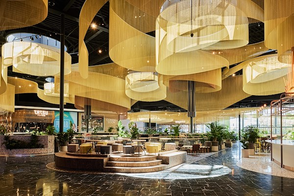 De vloeiende gordijnen aan het plafond volgen de beweging van lucht die in verschillende richtingen stroomt en plooien naar beneden bij de verschillende eetkiosken en markeren en definiëren deze plekken. Het delicate ontwerp geeft warmte en omarmt de bezoeker en zorgt ervoor dat de enorme ruimte op deze eerste verdieping je op een menselijke schaal begroet. Door het gebruik van verschillende lichtkleuren kan de sfeer worden aangepast aan de tijd van de dag of jaar en is het zeer veelzijdig qua sfeer.