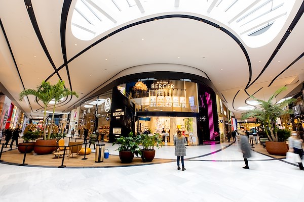 De algemene uitstraling en materiaal gebruik van het winkelcentrum is introvert. Het concept hierachter is dat deze basis de verschillende winkelmerken in staat stelt om te stralen. Dit maakt het winkelcentrum niet eentonig maar juist verschillend vanuit elke hoek. Het neutrale palet van witte, grijze en zwarte kleuren, leidt je continu en vloeiend door het winkelcentrum en de verschillende passages. Door het spelen met lijnen, (zelfde concept als de façade) deze te openen en te laten kruisen, waren wij in staat om verschillende eilanden te creëren binnen het winkelcentrum en ruimte te maken voor zitgelegenheden en kiosken. Dit is later ingevuld met het interieur van Saguez & Partners en de eigen concept studio van Unibail Rodamco Westfield.