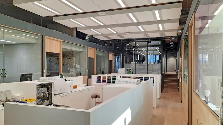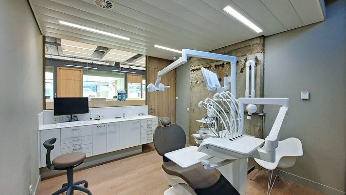 De voormalige parkeergarage van het Postgiro gebouw is getransformeerd naar een professionele en duurzame praktijk met 23 moderne en lichte behandelruimten. Binnen het rauwe betonnen casco is een verfijnd interieur aangebracht, waarbij grote delen van de oorspronkelijk garage intact zijn gelaten. De behandelruimtes zijn als losse, transparante cabines in de ruimte geplaatst en scheiden het loopgebied van de patiënten met het open werkgebied van de assistenten, tandartsen en praktijkondersteuners.