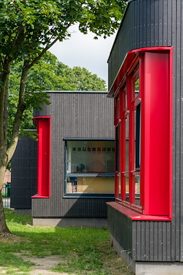 “Samen met de aannemer, Klusbedrijf Jef Bruijnincx Roosendaal, zijn we gaan kijken naar verschillende duurzame houten gevels. Cape Cod bood ons de meest optimale verhouding tussen prijs, kwaliteit en levertijd. We hebben vervolgens heel veel proefjes opgezet met lichte en donkere kleuren. Toch wel onverwacht kwam toen heel donker Cape Cod als winnaar uit de bus. We hebben het materiaal verticaal geplaatst voor het visuele effect en omdat we ook ronde binnen- en buitenhoeken hebben gebruikt. De school vond de uitvoering mooi chic en met de knalrode kozijnen zorgt het voor een mooi contrast. De uitstraling van het gebouw is nu ook veel rustiger, nu het in één kleur is uitgevoerd. We zijn zeker tevreden met het eindresultaat.”