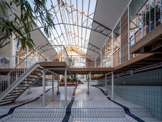 In het getransformeerde zwembad is de geschiedenis van het gebouw nog duidelijk voelbaar. Het originele zwembassin is behouden als gemeenschappelijke binnentuin, dat in de loop der tijd door het ontstane micro klimaat zal uitgroeien tot een mediterrane tuin. Het dak is ter plaatse van het originele daklicht open gemaakt om licht en lucht naar binnen te halen. De oorspronkelijke stalen dakconstructie is daarbij hersteld en in het zicht gebracht. Deze constructie loopt door in de woningen, waardoor de bijzondere gebouwgeschiedenis ook in het interieur zichtbaar is.