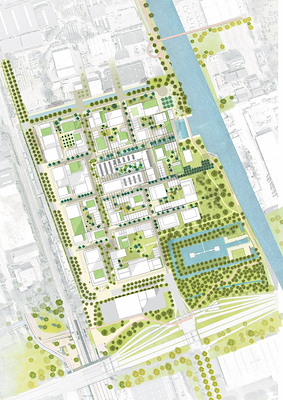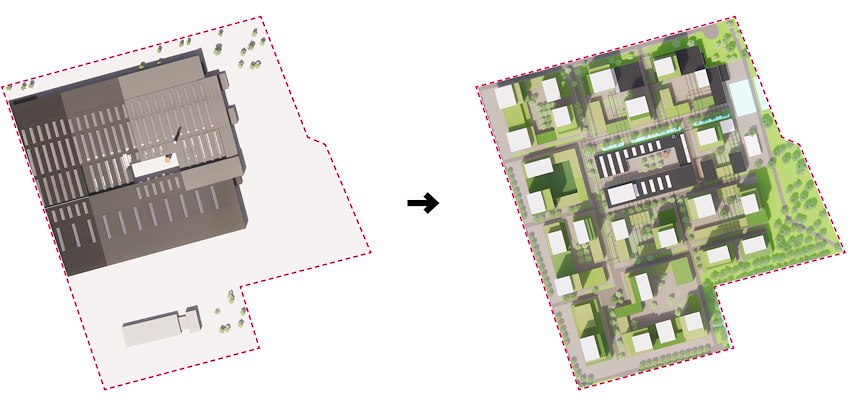 Deze typologische mix van kleinschalige woon-werkwoningen en daarboven middel/hoogbouw wordt als sjabloon gebruikt voor de nieuwbouw in het gebied om de bestaande fabriek heen. Hierdoor ontstaat een nieuwe unieke stadswijk met grote samenhang.