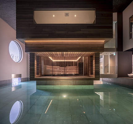 Voor de entree ontwierp Kuijten een lange balie in Dekton® Stonika Sogne in een glanzende XGloss afwerking. Sogne is geïnspireerd op de fameuze marmersoort Gris Pulpis, een bruin- tot grijzige marmersoort met een fijne ader. Kuijten koos voor een grijze uitvoering met tonen van natuursteen en cement erin verwerkt. Dat zorgt voor een even industriële als natuurlijke uitstraling, die uitstekend past bij de moderne oase in het groen die Spa One wil zijn.