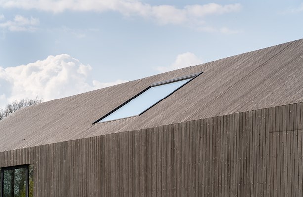 Wie het terrein van het Kleine Krikhaar op komt rijden, moet over de nodige verbeeldingskracht beschikken. Bij het zien van de langgerekte, abstracte schuurvorm kun je je nauwelijks voorstellen dat hier ooit een oude schuur stond. Door de verhoogde plint en de diepe uitkraging van de kopgevel lijkt het huis boven het maaiveld te zweven. In samenspraak met de gemeente Tubbergen, de commissie welstand en Reitsema & Partners werd er gekneed aan een plan om het landschap te verfraaien. Weerink blikt terug: “We wilden uitgaan van het oorspronkelijke ontwerp. Een solitair object zonder bijgebouwen. Daarnaast is het landschap altijd een belangrijke pijler geweest. Op ons erf staat een grote boom die als ankerpunt heeft gefungeerd. De woning is haaks op deze zichtlijn en anderhalve meter boven het maaiveld gepositioneerd. Hierdoor krijg je dat zwevende effect en wordt het uitzicht over het landschap versterkt.”