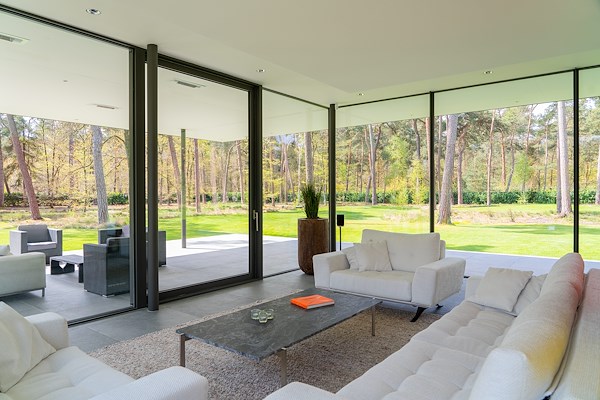 De glazen gevels aan de zuidzijde van Villa LP zijn uitgevoerd als triple-beglazing voor extra isolatie en comfort. Omdat naast de praktische eisen het uitzicht in deze woning ook van groot belang is, hechtte Willems veel waarde aan het glas- en kozijnwerk. “Wanneer je woning voor driekwart deel uit glas bestaat, moet je wel weten wat de mogelijkheden zijn. Daarom zijn we al in het voortraject met Reynaers Aluminium en gevelbouwer Gruijters Aluminium BV. om de tafel gegaan. Onze ideeën moesten immers wel uitvoerbaar zijn. We waren nadrukkelijk op zoek naar niet al te prominente profielen omdat die afbreuk doen aan het uitzicht. Hetzelfde geldt voor de schuifdeuren. Die wil je zo min mogelijk aanwezig laten zijn. Bovendien moeten ze passen in de ritmiek van het gebouw. Doordat Reynaers Aluminium goed met ons meedacht, kun je in dit huis vier seizoenen lang van een steeds veranderend panorama genieten.”