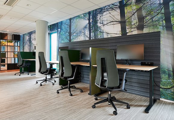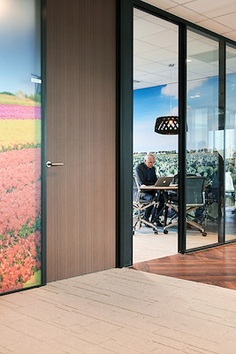 In onze Call bureauwanden komen de kleuren van het polderlandschap terug door de diverse groene stofferingen. Zo is het nieuwe gemeentehuis een prachtige plek geworden, waar medewerkers iedere dag met veel plezier aan het werk gaan.