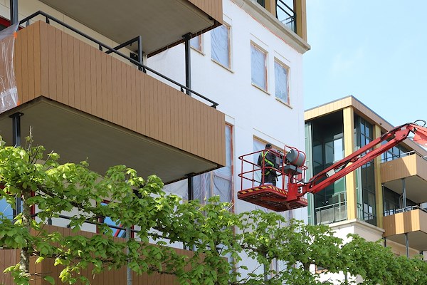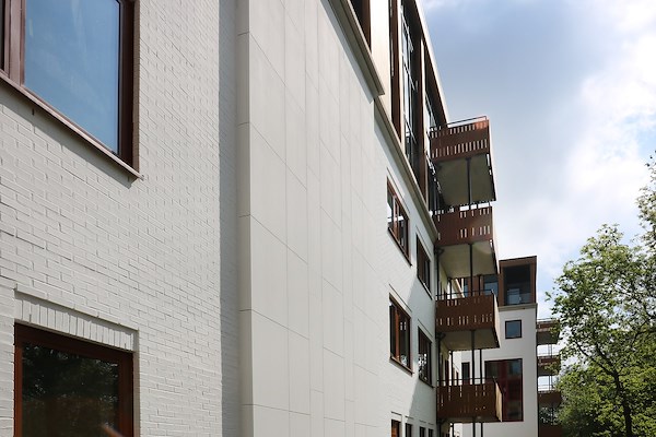Alle buitengevels, totaal 8.500 vierkante meter, worden nu afgewerkt met Sylitol NQG in twee kleuren. Van Wanrooij: “Het totale verfsysteem kan nu relatief makkelijk water opnemen en weer afstaan. Na een regenbui, maar ook na een koele nacht met ochtenddauw, zijn de gevels weer snel droog. Hierdoor heb je minder snel vervuiling door aangroei van algen.” Van de Kerkhof: “Door de verschillende ondergronden waarop de twee kleuren zijn aangebracht, ogen de gevels niet statisch. En door de witte ‘toon’, spreken de gepoedercoate aluminium kozijnen - die een polijstbeurt hebben gehad – en de geplaatste balkons nog meer”.