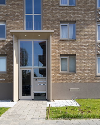 De huidige gesloten en drukkende entree openen we door een dubbel hoge opening te maken die wordt omkadert met een lijst. Het uitknikkende kader zorgt voor een uitnodigend gebaar waar je ook nog eens droog kan staan. Ook het portiek zelf is opgefrist. Samen met de bewoners zijn er verschillende kleur- en patroonpaletten ontwerpen die zorgen voor een eigen sfeer per portiek. De nieuwe entreedeuren met de galm beperkende akoestische panelen verbeteren het wooncomfort.