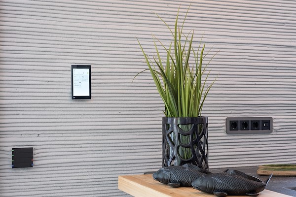 Deze bijzondere 3D-betonprinting vereiste een holistische kijk op het bouwproces, waarbij ook de elektrische planning in een vroeg stadium moest worden meegenomen. De Smart Home-planning werd uitgevoerd door Michael Freudenreich van HomeTEC Solution en is in principe vergelijkbaar met die van een klassiek gebouwde nieuwbouw: het geïnstalleerde KNX-systeem wordt aangestuurd door de compacte Gira X1-server in combinatie met de Gira S1 ‘onderhoud op afstand module’ en op elke verdieping twee Gira G1-bedieningspanelen. De overige functies worden via de nieuwe Gira tastsensor 4 aangestuurd. De stopcontacten zijn geïntegreerd in de afgeronde Gira designlijn E3. De deurcommunicatie vindt plaats via het Gira System 106, de G1 dient als huisstation.