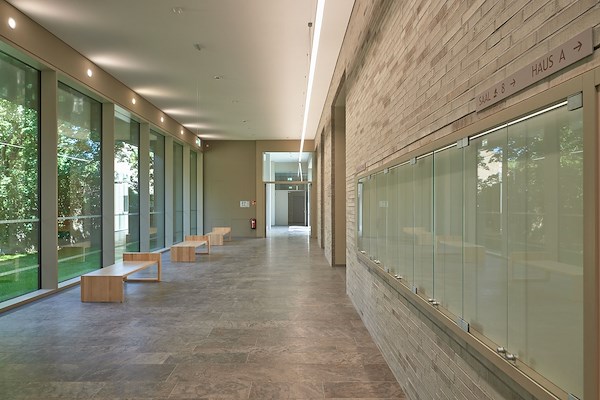 Om te voldoen aan hedendaagse veiligheidsvoorschriften, ontwierp ABELMANN VIELAIN POCK ARCHITEKTEN BDA een nieuwe centrale entree. „Deze nieuwe ingang zorgt, ondanks de beperkte beschikbare ruimte, voor een riant en transparant ingangsgebied. De entree ligt centraal tussen oud- en nieuwbouw, nabij alle rechtszalen en zorgt zo voor korte routes en een goede oriëntering,“ aldus projectarchitect Walter Vielain.