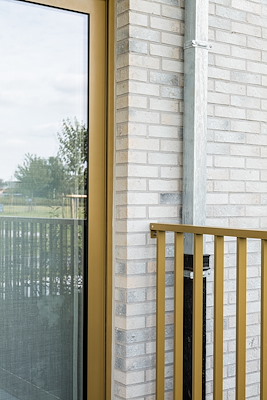 “Tijdens de ontwerpfase hebben we altijd extra aandacht voor het schrijnwerk”, vertelt Laurence Evrard van Studio Inarco. Samen met ELD architecten ontwierpen zij dit appartementencomplex. “Omdat we kozen voor een lichte gevelsteen in een olijfgrijze tint, wilden we de gevel extra cachet geven door goudkleurige aluminium ramen, deuren, schuiframen en balustrades.”