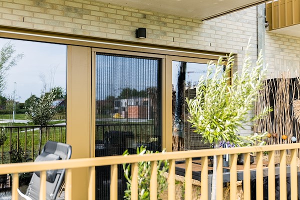 “De architecten wilden een profiel met goudanodisatie” zegt zaakvoerder Kenny Van Stappen van Decaro. “Echte anodisatie is duurder dan gelakte aluminium profielen en bovendien niet krasbestendig. Voor dit appartementencomplex was het niet de ideale oplossing; je moet er voorzichtig mee omspringen en niet elke bewoner kan het appreciëren als er een krasje te zien is”. Als alternatief stelden ze het gepoederlakte aluminium profielen van Aliplast Aluminium Systems in de kleur 8000M voor. Esthetisch voldeed dit aan de wensen van de architect en het lag qua prijs in de lijn van het vooropgestelde budget. Als bijkomende voordeel geldt er op deze gelakte profielen van Aliplast Aluminium Systems 25 jaar lakgarantie is. Een zekerheid dus dat de oorspronkelijk kleur blijft behouden.